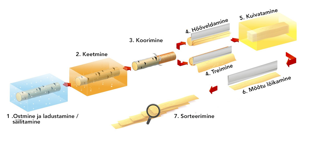Peale keetmist tõstetakse palgid välja ja kooritakse. Kõik see toimub automaatselt tootmisliinil ja väga kiirelt. Palgi otsad trimmitakse ja vajadusel järgatakse õigesse pikkusesse. Järgnevalt on kaks võimalikku varianti: vineeritööstuses palgid treitakse spooniks ja mööblitööstuses kas treitakse või hööveldatakse spooniks.